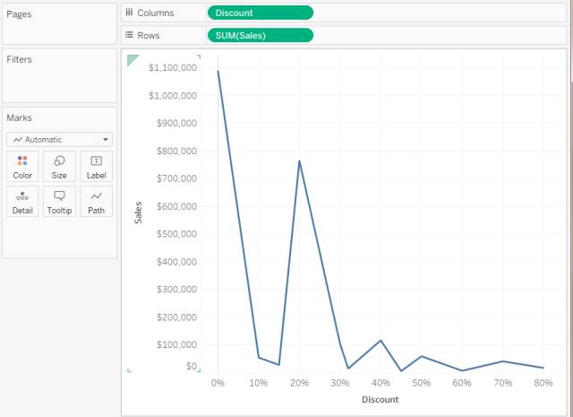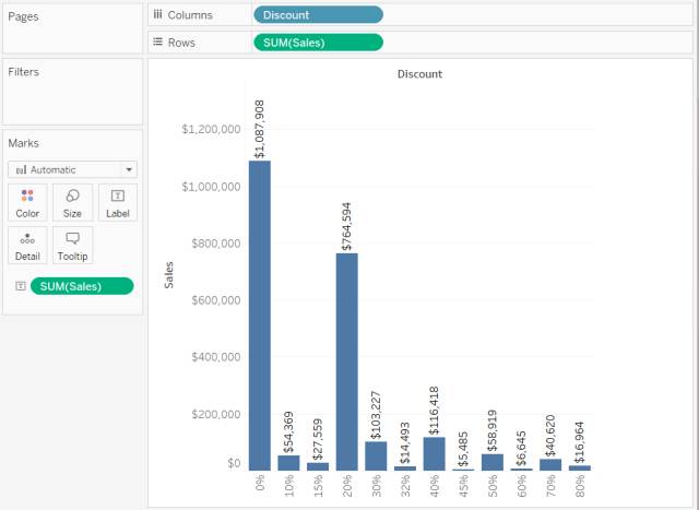 您可以从“数据”窗格中的“度量”区域拖动字段,但随后将其用作视图中的维度。例如,假设您想要了解每个可能的折扣率的聚合总销售额,那么您期望的视图如下所示: