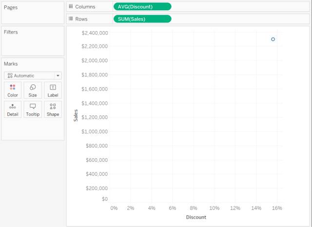 Tableau 以 AVG 形式聚合“Discount”(折扣),并以 SUM 形式聚合“Sales”(销售额)。这些字段都是连续的,因此 Tableau 将沿视图的底部和左侧显示轴(而不是列或行标题)。