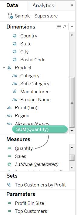 当您第一次连接到数据源时,Tableau 会将包含定量数值信息的任何字段(即其中的值为数字的字段)分配给“数据”窗格中的“度量”区域。