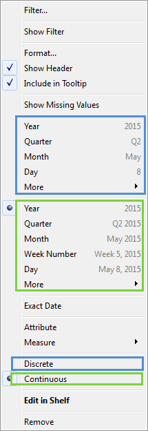 如果要将维度设为连续(在未首先将其转换为度量的情况下),则您的选项有限。您只能对日期维度(日期维度可能为离散或连续,但始终是维度)和数值维度这样做,并且您无法转换包含字符串或布尔值的维度。
