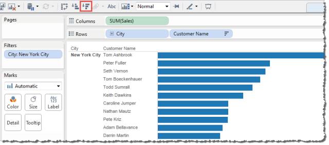 STEP 6:将“Region”(区域)维度拖到“行”功能区,并将其放到“Sales”(销售额)的左侧,以便为地区销售额生成多个轴。