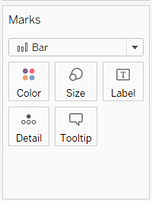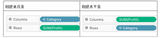 条形图使用条标记类型。当数据视图与如下所示的两种字段排列方式之一匹配时,Tableau 会选择此标记类型。您可以向这些功能区中添加其他字段。