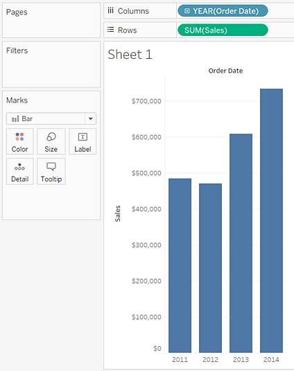 STEP 3: 将“Sales”度量拖到“行”功能区。度量将聚合为总和并将显示一个垂直轴。当“列”功能区上有一个维度且“行”功能区上有一个度量时,Tableau 将显示一个条形图(默认图表类型)。