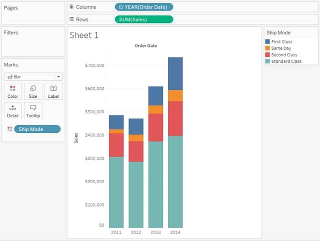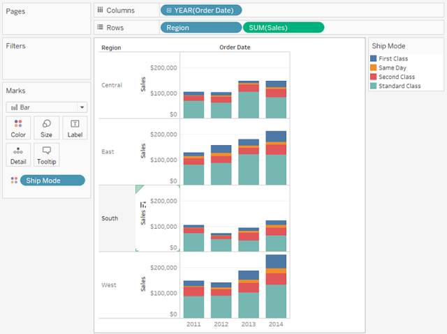 STEP 5: 将“Ship Mode”(装运模式)维度拖到“标记”卡的“颜色”上。