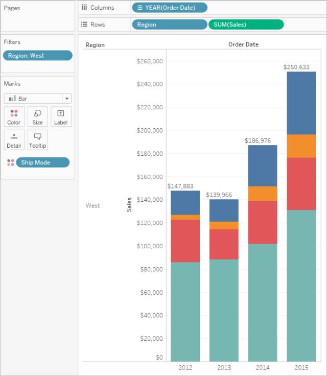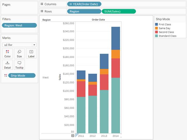 此视图使您能深入了解您的数据,例如西部的装运模式在四年期间内发生了怎样的变化。