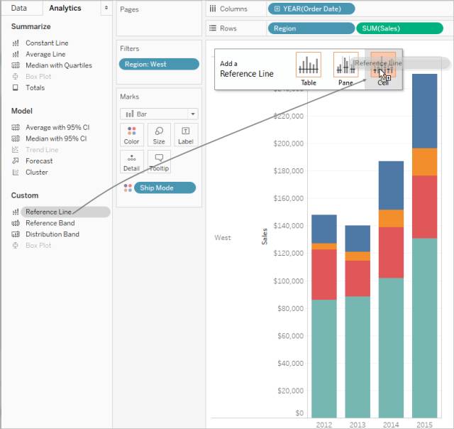 STEP 1: 从“分析”窗格中,将“参考线”拖到视图中,并将其放在“单元格”上。