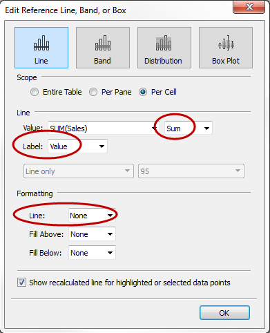 STEP 2:在“编辑参考线、参考区间或参考箱”对话框中,将“SUM(Sales)”的聚合设置为“总和”,将“标签”设置为“值”,并将“格式设置”下的“线”设置为“无”: