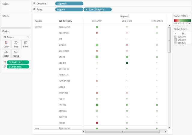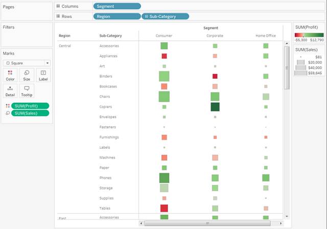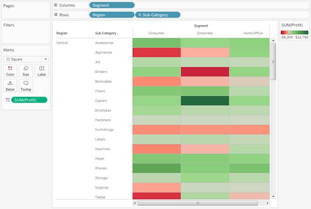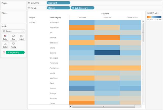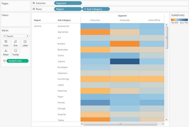 若要创建热图了解利润如何随地区、产品子类和客户细分市场变化,请按以下步骤进行操作: