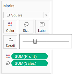 STEP 8: 将“Sales”(销售额)度量拖到“标记”卡上的“大小”以便通过“Sales”(销售额)度量控制框的大小。您可以比较绝对销售额(按框的大小)和利润(按颜色)。