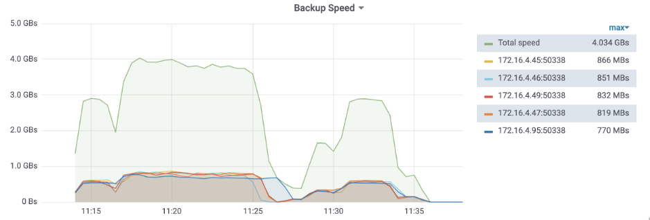 我们备份了两张表,绿线是整体的备份速度,其余线条是各个 TiKV 节点备份速度。 11:15 和 11:28 在备份索引数据,由于索引数据内容较短,所以备份速度有些下降。