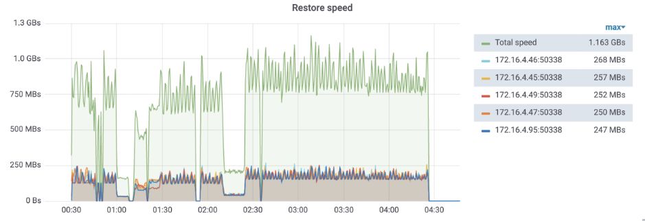 我们恢复了之前备份下来的两张表,同样的,绿线是整体速度,其他线条为各个 TiKV 节点恢复速度。 恢复期间的毛刺是因为我们将恢复任务拆分成一个个小任务,各个小任务之间串行执行(潜在优化点)。1:00 和 1:15 恢复速度下降同样也是由于索引内容较短导致。