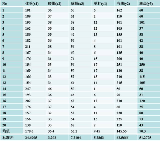 根据体能训练的数据进行最小二乘回归建模,样本为某健身俱乐部20位中年男子身体特征指标,包括体重、腰围和脉搏,如表2所示。