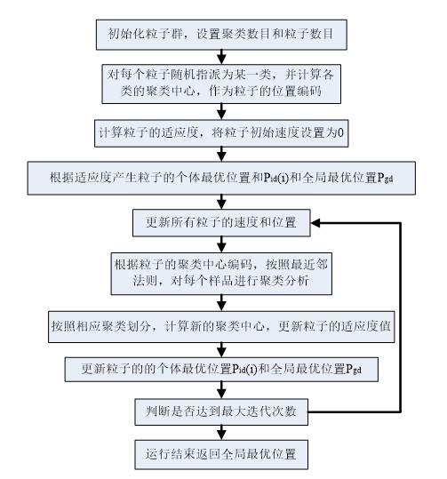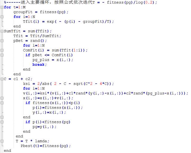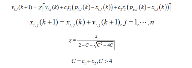 基于模拟退火的微粒群算法中的微粒群算法采用带压缩因子的PSO优化算法,Clerc和Kennedy提出的带压缩因子的PSO优化算法通过选取合适参数,可确保PSO算法的收敛性,并可取消对速度的边界限制。速度和位置更新公式如下: