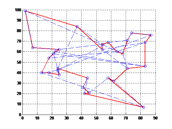 旅行商问题(Traveling Salesman Problem,简称TSP),也称货郎担问题,是数学领域中的著名问题之一。TSP问题已经被证明是一个NP-hard问题,由于TSP问题代表一类组合优化问题,因此对其近似解的研究一直是算法设计的一个重要问题。该问题的求解算法主要分为两类。一类是与问题特征相关的启发式搜索算法。主要有动态规划法、分支界定法等。另一类是独立于问题的智能优化算法,如模拟退火法、禁忌搜索法、蚁群算法、遗传算法、粒子群算法等。