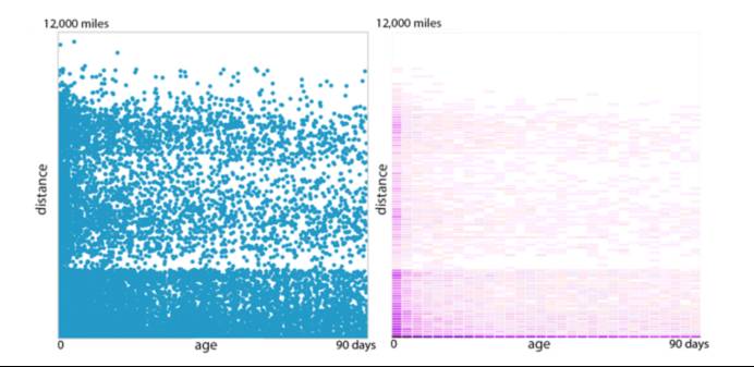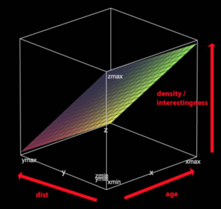 那么怎么评估两者之间的重要程度呢?距离是否和工作发布的时间长短一样重要?或者说距离是3倍重要于工作发布的时间长短? 为了回答这个问题,我们画了很多像下面这样的图表。