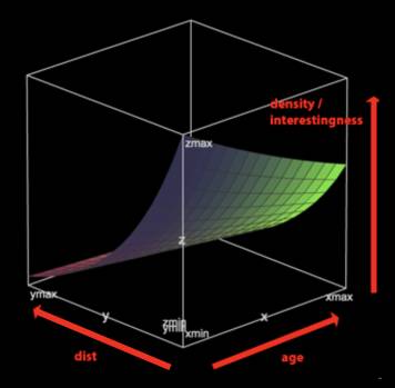 所以我们做了如下尝试:我们把用户和对应工作之前的距离(可以从用户IP地址来获取这个数据)乘上工作发布的时间长短,通过这种方式我们可以得到一个工作的得分,然后用这个得分对工作进行排序。