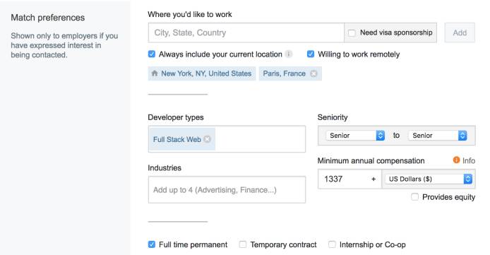我们知道还有很多其他的维度决定了一个工作是否与你相关,例如等级、工资、行业,开发类型(全栈或移动端)等等。为了表示这些,我们引入了工作匹配偏好(Job match preference)(https://stackoverflow.com/users/jobsearch/current?utm_source=so-owned&utm_medium=blog&utm_campaign=gen-blog&utm_content=blog-link)。
