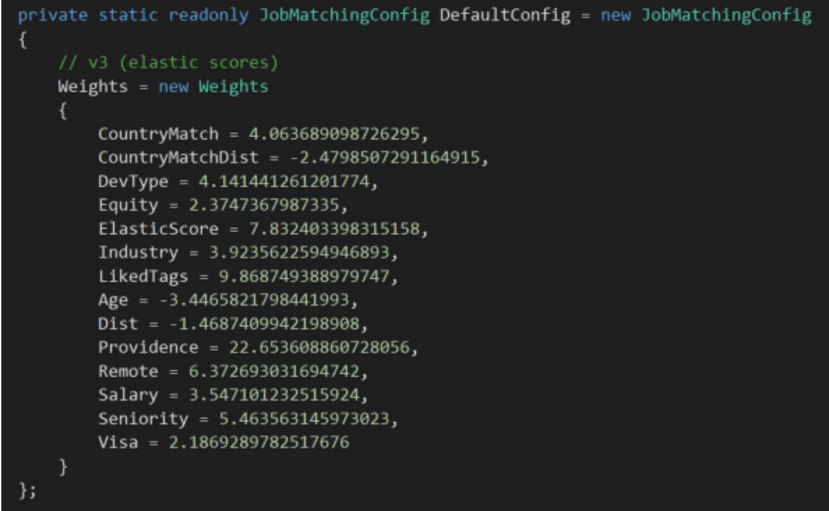 于是现在我们能够重新设一组权重,然后获得一个对性能的即时衡量。在这个基础上,我们能开发一个遗传算法(https://en.wikipedia.org/wiki/Genetic_algorithm)来尝试千千万万种可能的权重组合,然后在其中选出最好的一组权重。这都是我们用来获取实际应用中的匹配算法中的权重的方式。