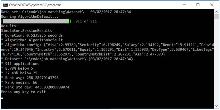 根据分数对工作进行降序排序,然后在排序后的列表中找到用户申请过的工作的位置。例如:“对123号申请人,他申请的工作在模拟结果中的第6个位置”;