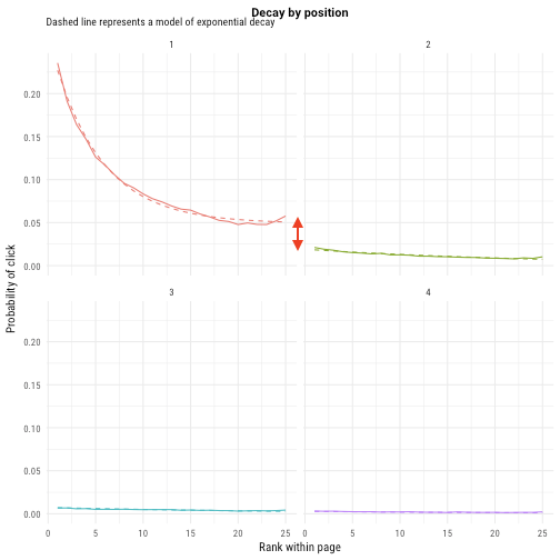 工作在结果中排的越靠前,被点击得就越多。上面的每一个图都代表了一页(第一页,第二页…)。我们发现在第一页的最后一个结果要比在第二页的第一个结果获得更多点击。