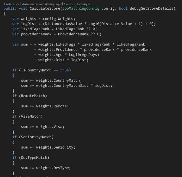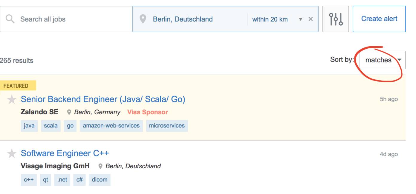 直到此时,匹配算法仅仅被用在了Stack Overflow Jobs的主页上。换句话说,当你在页面上键入像C++这样的关键字,或者筛选了高级工作,那么工作匹配算法就用不到了。工作会由后台的搜索引擎Elasticsearch进行排序。我们决定对所有工作的搜索结果默认用“按匹配(matches)排序”。A/B测试也证实了这种变化能大大增加工作的访问量和申请量。