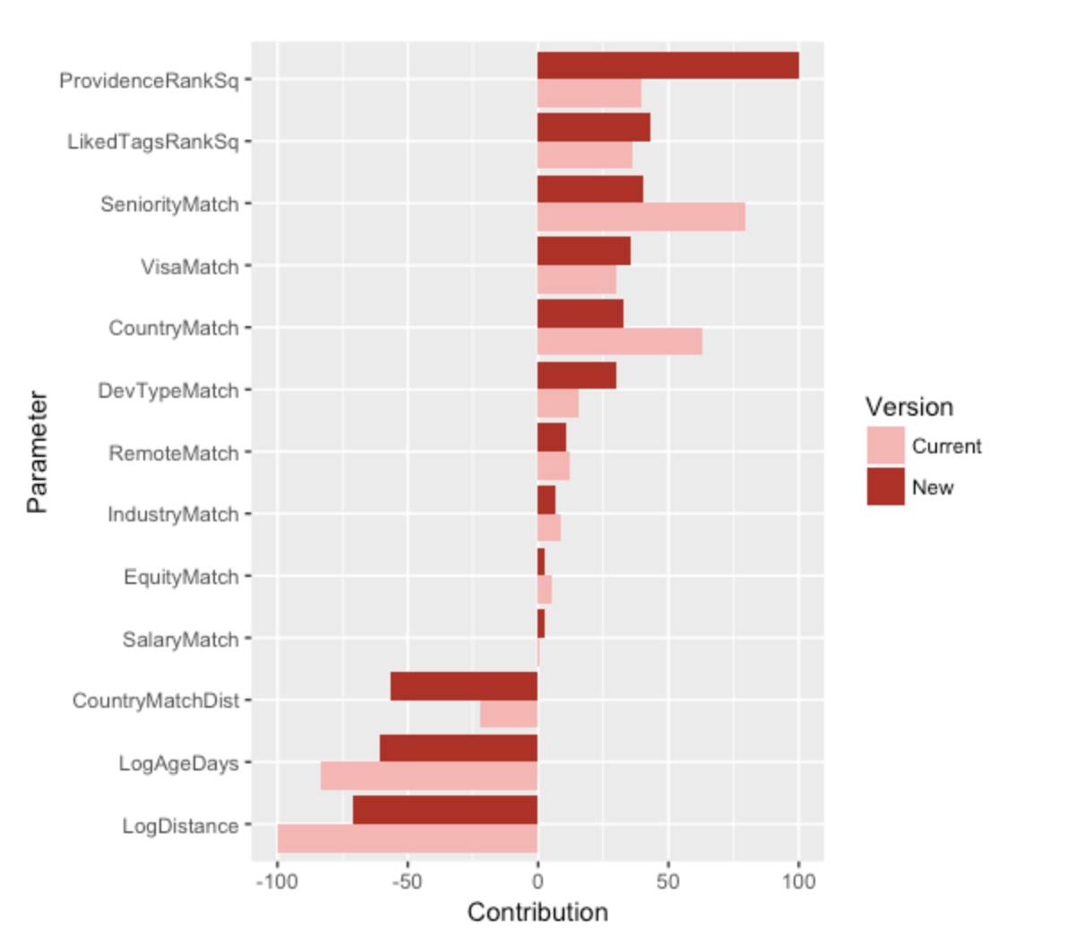 特征在兴趣度公式中的贡献度。Current和New指的是匹配算法的版本。