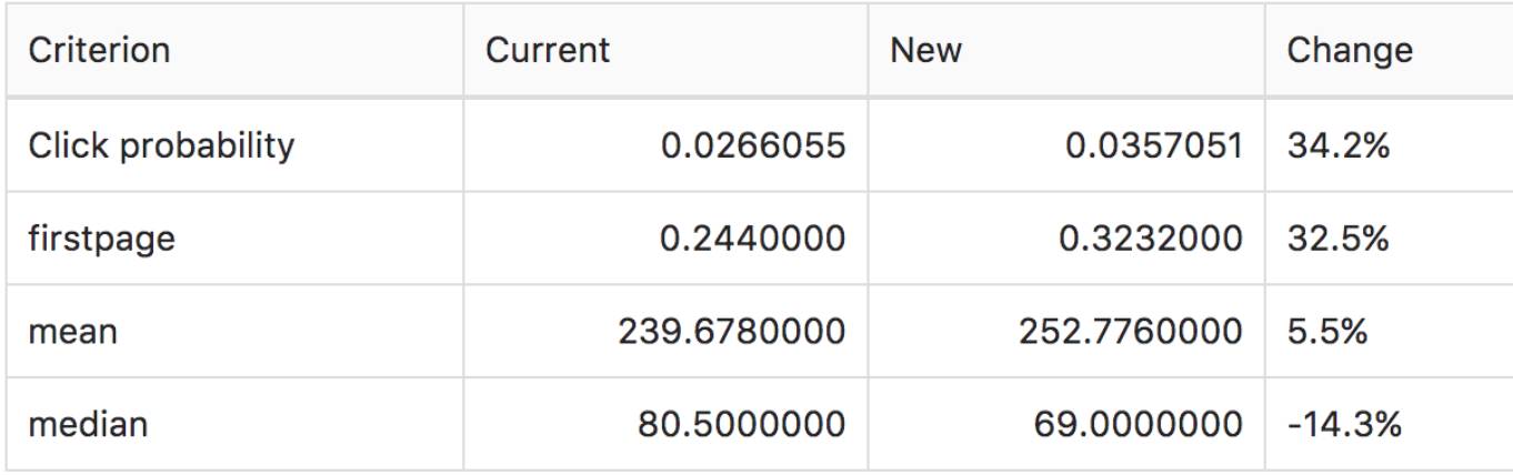 工作申请的平均序号给了我们一种衡量匹配算法表现的方法。这个平均序号越小,我们对工作的排序越好。我们可以通过不同权重组合来尝试不同的兴趣公式,然后在几秒钟就能通过模拟来衡量我们的工作排序的效果如何。远远好于等好几周来得到A/B的结果!