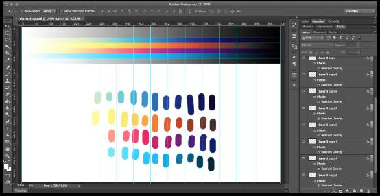 无论你需要2种颜色还是10种,渐变中都能提取出这些颜色,让可视化图表感觉自然,同时保有足够的色调与明度差异。一个使用渐变的好方法就是:在Photoshop中拉辅助线到断点位置,与数据的数量对应上,然后持续对渐变进行测试与调整。