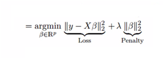 在这个等式中,有两个组成部分。第一个是最小二乘项,另一个是 β2(β-平方)和的 λ 倍,其中 β 是相关系数。λ 被添加到最小二乘项中用以缩小参数值,从而降低方差值。