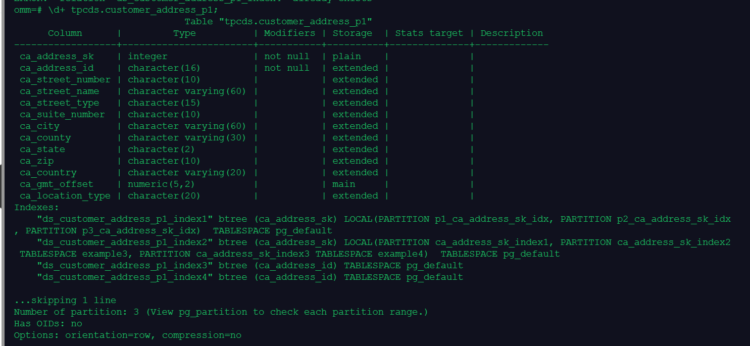 CREATE INDEX ds_customer_address_p1_index4 ON tpcds.customer_address_p1(CA_ADDRESS_ID);查看索引信息: