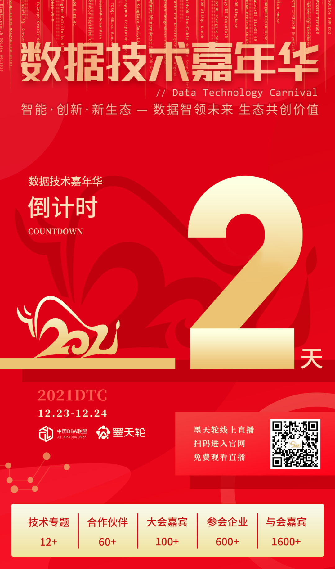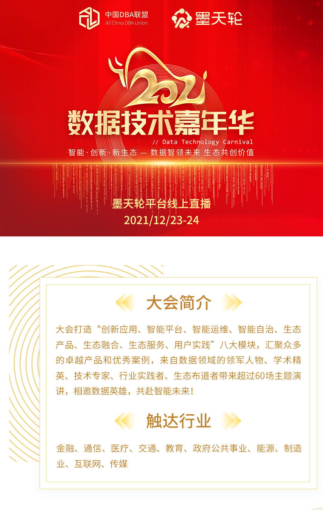 12月23-24日,由中国DBA联盟与墨天轮联合主办,云和恩墨协办的2021数据技术嘉年华将在线上盛大开启。大会以“智能·创新·新生态——数据智领未来 生态共创价值”为主题,相邀数据英雄,共赴智能未来!