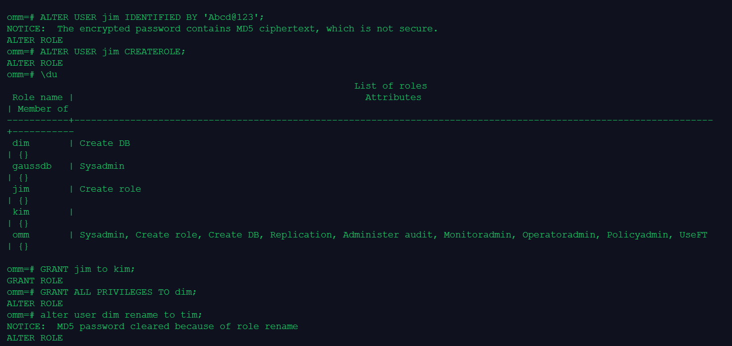 omm=# alter user dim rename to tim;NOTICE: MD5 password cleared because of role rename