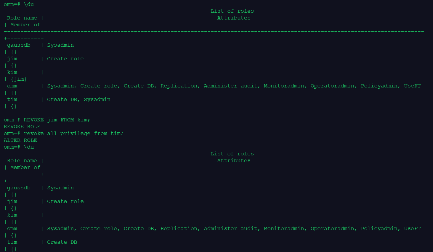 omm=# ALTER USER jim CREATEROLE;ALTER ROLE