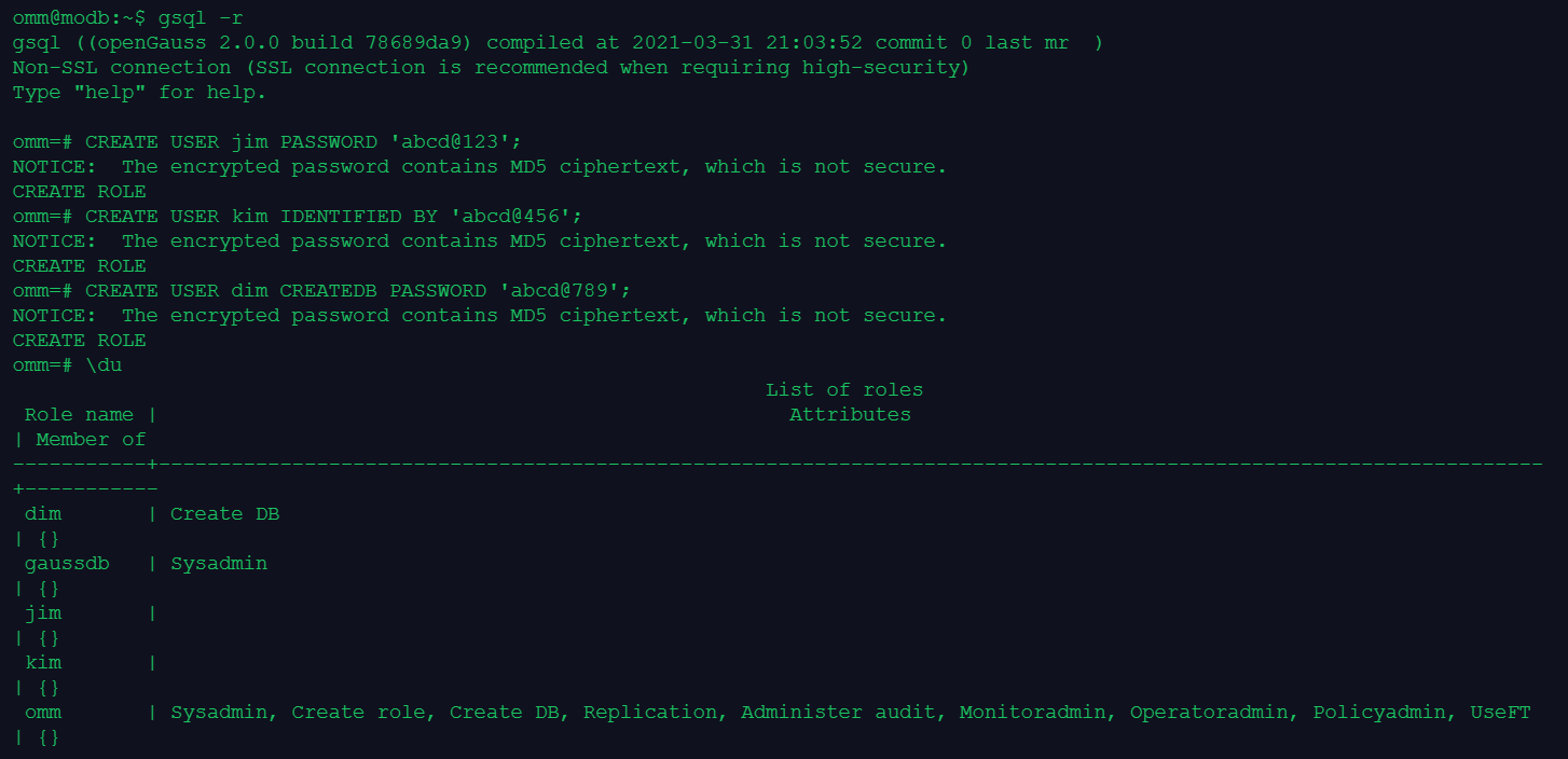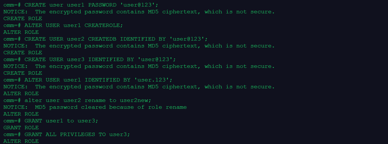 omm=# CREATE user user1 PASSWORD 'user@123';