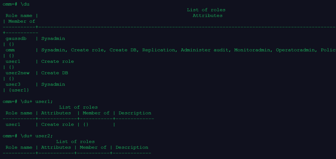 omm | Sysadmin, Create role, Create DB, Replication, Administer audit, Monitoradmin, Operatoradmin, Policyadmin, UseFT