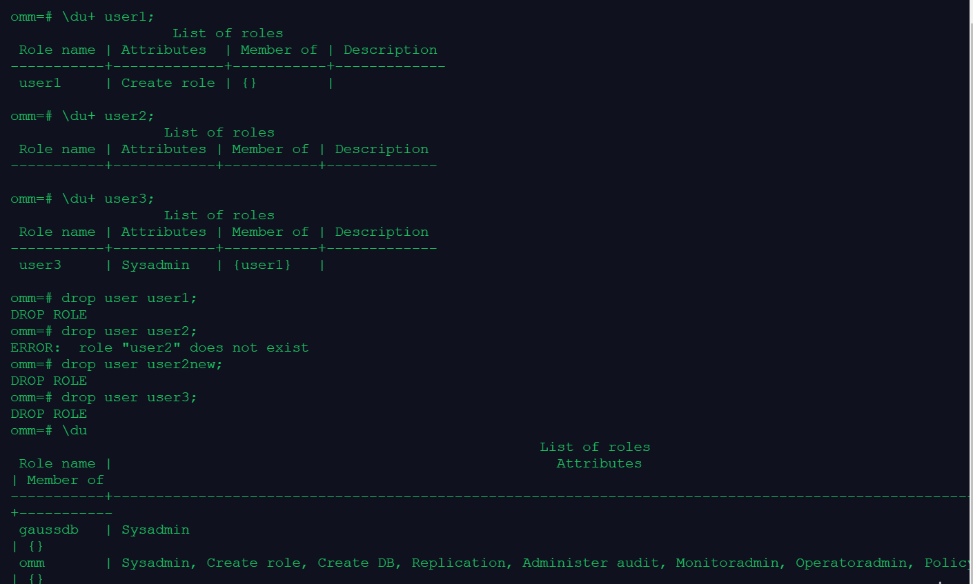 omm=# CREATE USER user3 IDENTIFIED BY 'user@123';