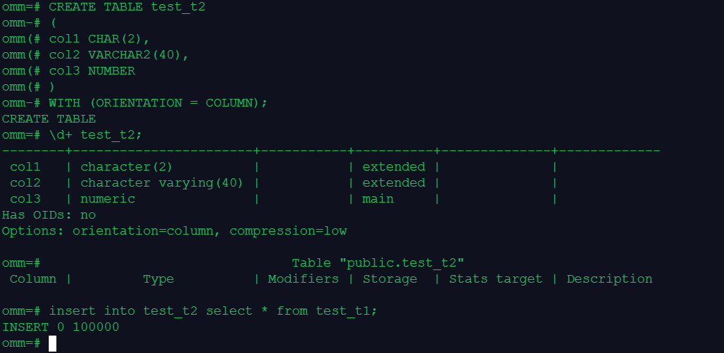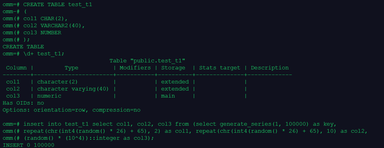 1.创建行存表和列存表,并批量插入10万条数据(行存表和列存表数据相同)