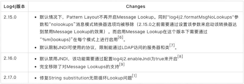 目前 Log4j 已发布了 2.15.0,2.16.0 和 2.17.0 版本,具体修复内容如下: