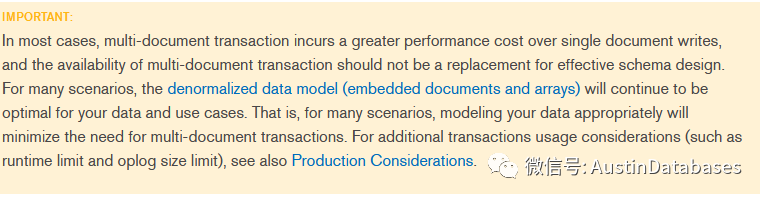 其中指明了,事务操作会引起性能方面的消耗(greater performance),并且不能因为有了事务,我们就把mongodb 当传统数据库使用,即使是传统数据库,大事务等等也是我们在使用中避免甚至对有些RDBMS是禁止的。