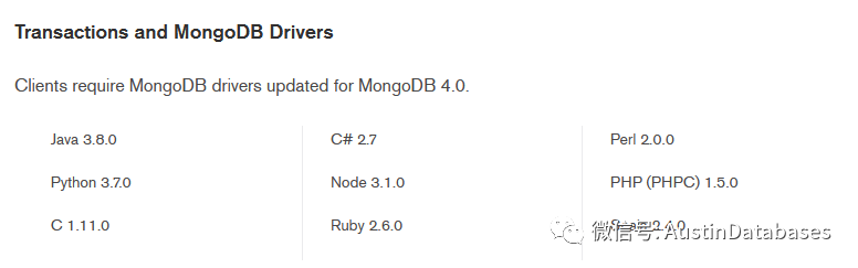 mongodb 操作事务的方式支持 java , python C# 等等具体的版本和语言在下图