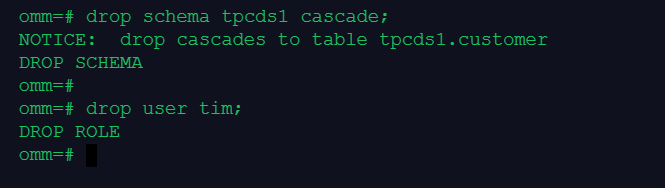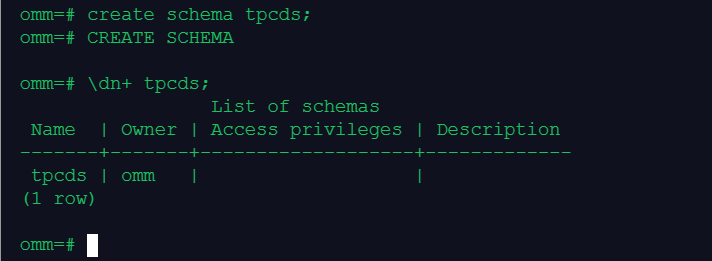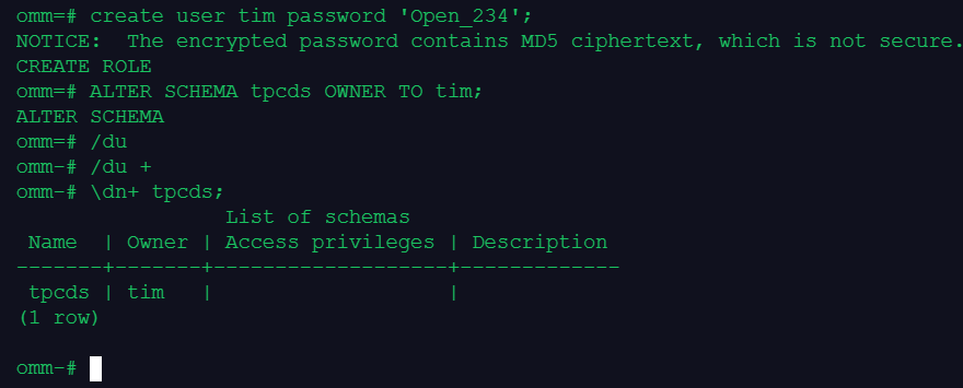 2.创建一个用户tim, 并将tpcds的owner修改为tim,且修改owner前后分别使用\dn+查看模式信息