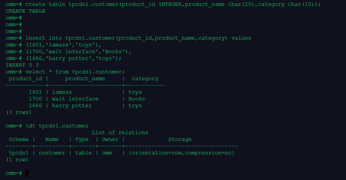 4.在模式tpcds1中建表customer、插入记录和查询记录