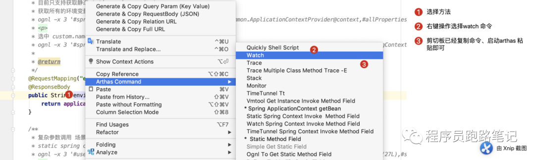 arthas 还有很多更高级的用法,但是一些命令容易忘记,表达式又有一定的语法门槛也难记忆,好消息是在插件里面都有封装,我们只需要点点点就能快速的生成命令,便于在服务器上粘贴执行了,强烈推荐 https://www.yuque.com/arthas-idea-plugin/help/pe6i45