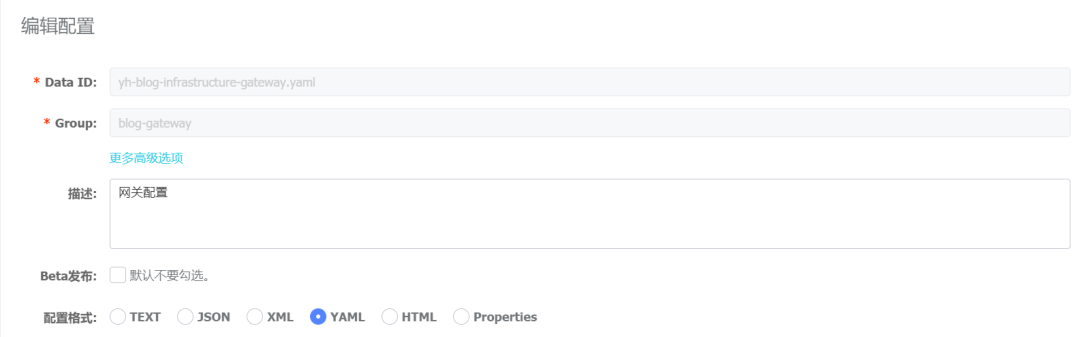 server:port: 9001#配置应用服务名称spring:application:name: yh-blog-infrastructure-gatewaycloud:nacos:discovery:#配置nacos虚拟IP地址server-addr: 192.168.117.110:8848config:server-addr: 192.168.117.110:8848file-extension: yamlgroup: blog-gatewayprefix: ${spring.application.name}