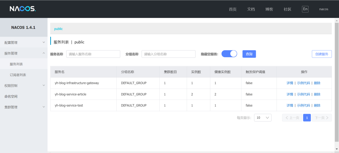 依次启动 article、test、gateway 服务,为了测试负载均衡,我们启动两个article服务,我们可以看到nacos中的配置列表和注册列表如下所示: