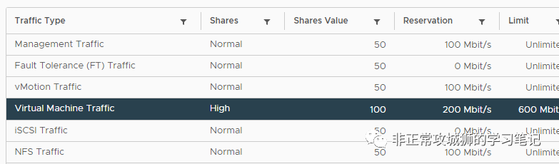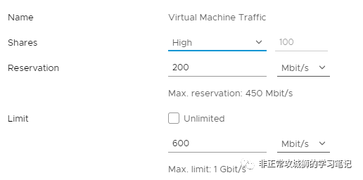 如上图所示,其实每一种流量除了预留和限制之外,还有一个“共享”的权值。如果各种流量最终会完全占用1Gbps的带宽,那么对于虚拟机流量而言,它可用的最大带宽:最大带宽=200+100/(100+50+50+50)*500=200(预留)+200(争用)=400Mbps同理,NFS可用的最大带宽=100+50/(100+50+50+50)*500=100+100=200Mbps