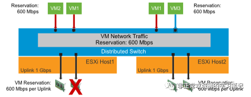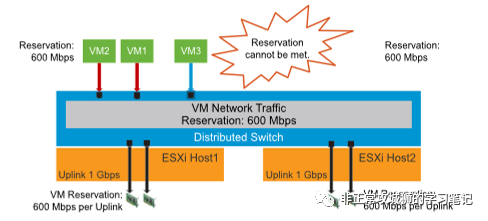 同样的道理,如下图所示,当ESXi1的其中一根上行链路出现故障,已经无法同时满足VM1和VM2的带宽预留要求的时候,DRS会将两台虚拟机中带宽占比高的一台虚拟机迁移到其他带宽充裕的ESXi主机上,从而实现NIOC配置文件预留的要求。