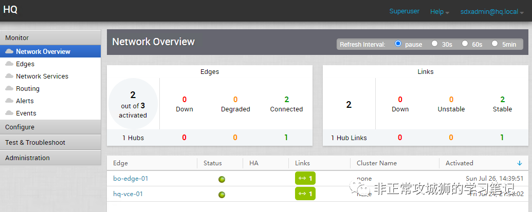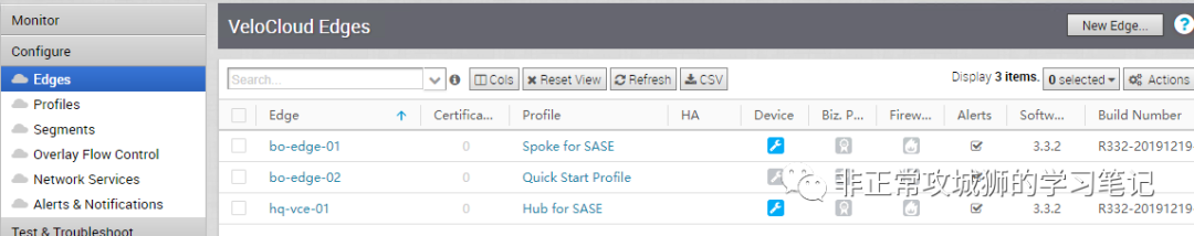 在前一篇分享中,晓冬向各位描绘了VMware SD-WAN by VeloCloud(后文称VeloCloud)的基本拓扑和组网模型。与VMware NSX数据中心产品相类似,VeloCloud也分可大体分为管理平面、控制平面和数据平面。在之前的分享中,晓冬和大家已经完成了Gateway和Edge的注册,组建了Hub-Spoke的双站点基本框架。如下图示,管理员可以在Orchestrator界面可以查看所有组件的状态。