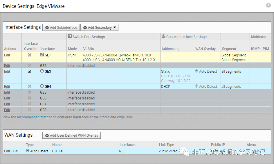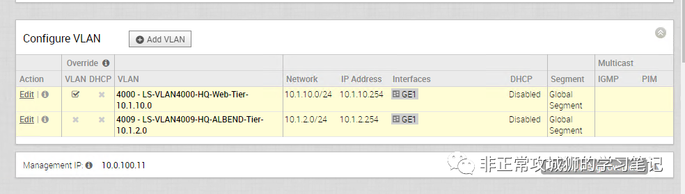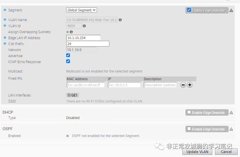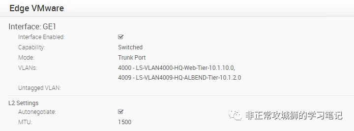 我们可以将Edge视为一台普通的三层交换机设备,用来作为站点内部所有分段的网关使用。管理员通过几次简单的鼠标点击和配置,就可以声明该站点内使用到的VLAN。