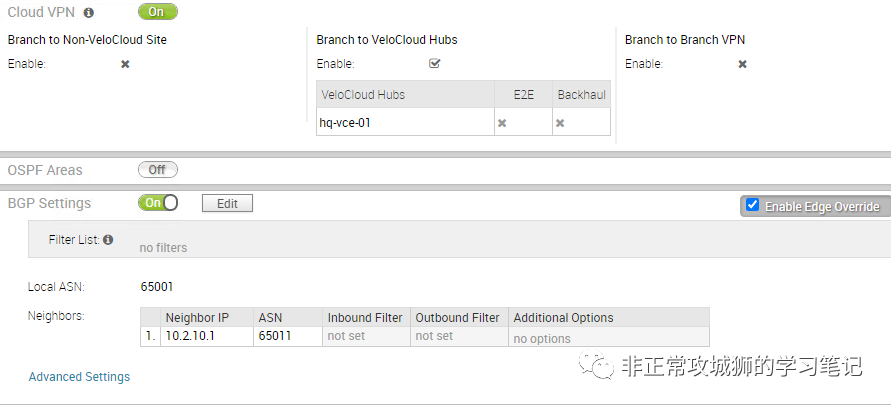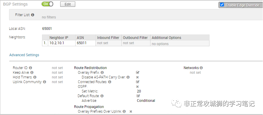 0x03.动态路由协议配置Edge支持BGP和OSPF两种不同的动态路由协议,由于是和NSX DC集成,晓冬将演示如何使用BGP实现动态路由和互联。首先,管理员同样是要在Edge设备的“Device”页面,激活BGP功能;